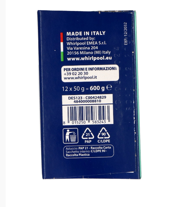 WASHING DEGREASER / DESCALER – 12 שקיקים של Whirlpool, מסיר אבנית ושומנים במקביל, מתאים לכל סוגי מכונות הכביסה ומדיחי הכלים. תוצרת איטליה, איכותי ומקצועי.